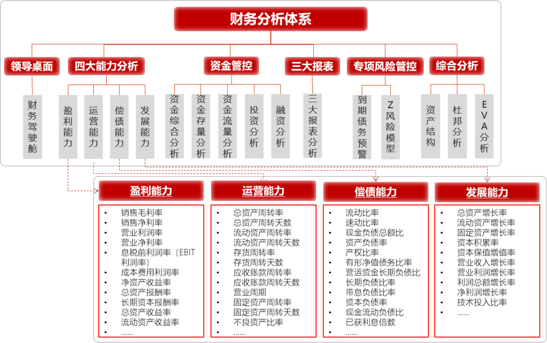 企业基于整体财务数据汇总,可建立不同的财务指标分析模型进行多维度多口径的分析,对错报和舞弊风险进行及时预警,并进行改进,从而为管理决策提供准确的财务信息或数据支撑。企业的财务分析指标和模型可以按照集团、板块、公司、部门等不同层级的战略和管理要求进行选择,对各种财务指标还可以进一步分解,对关键风险点可以进行穿透式监控,进而进行多层级更深入的风险监控和识别。常见的财务指标分析体系或模型举例如下: