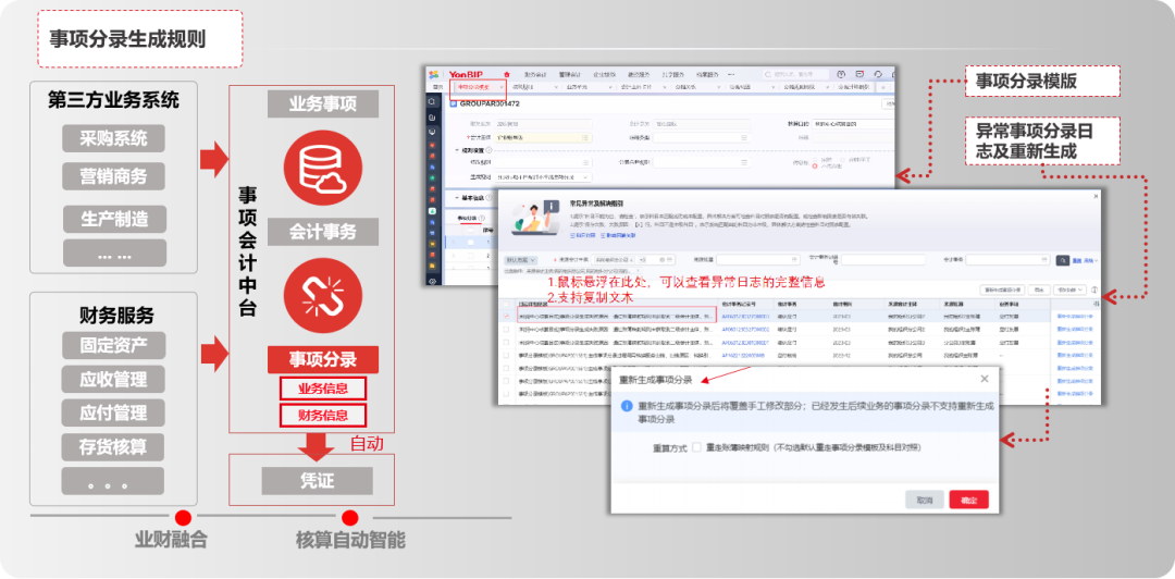 通过入账规则设置以及入账分录异常校验和预警,确保会计分录的准确性,具体可按会计事务定义事项分录模板,通过事项分录规则设置,实时自动生成业财事项分录,通过分录校验规则进行分录异常识别,对异常问题跟进后重新生成准确的事项分录。