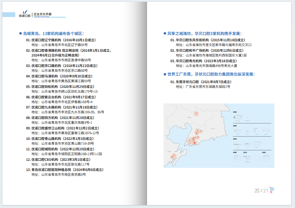 时至今日,优诺口腔辐射青岛、哈尔滨、潍坊、东莞四座城市,拥有优诺、华贝、牙状元等口腔品牌,累计开设近30家口腔诊疗机构,为更多市民朋友提供全口腔、全家庭、全生命周期的高品质口腔健康管理。