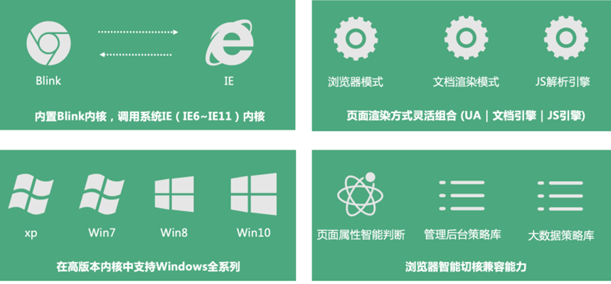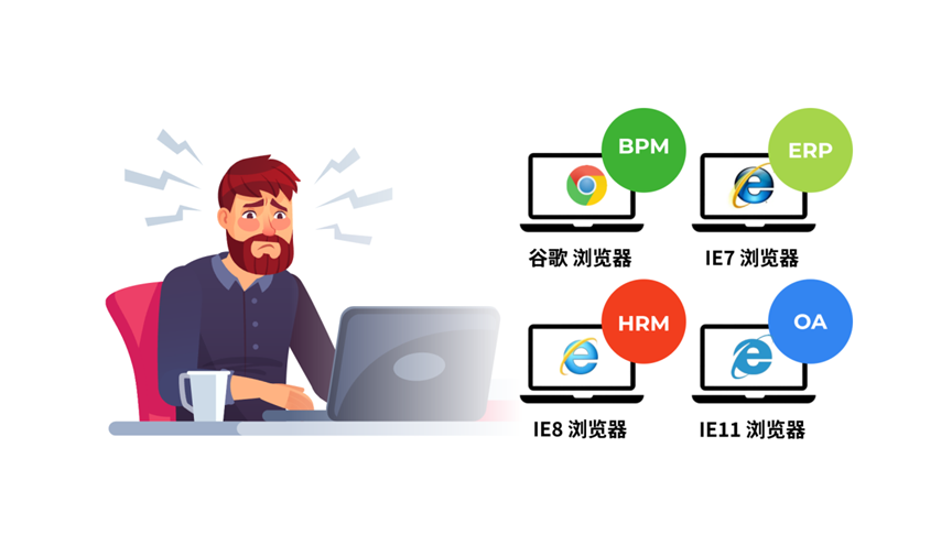 这主要是由于面向政企机构的业务系统建设年代通常较为久远,页面兼容性问题在工作中带来各种不同的现象,如页面显示异常、登录困难、插件加载失败等。对于普通业务人员来讲,很多时候他们不得不在同一台电脑上安装各种不同的浏览器,来访问对兼容性有不同需求的业务系统。