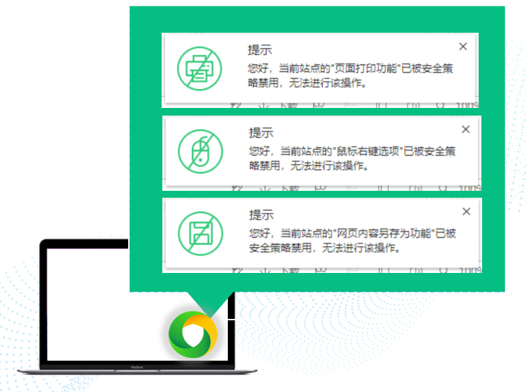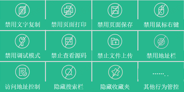 在用户行为策略方面,360企业安全浏览器可以限制用户在访问全局网站或指定网站中对相关动作的禁止与允许,全方位保护企业的内部数据资产,如:禁止网页复制、禁止网页打印、禁止网页另存为、禁止调用开发者工具、禁止鼠标右键、禁止查看页面源码、禁止文件上传、禁止文件下载等。