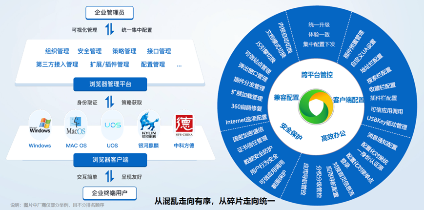 但只要精神不滑坡,方法总比问题多。360企业安全浏览器像是一把“互联网的瑞士军刀”,不同的问题会有不同的“刀工”。首先,其利用管理后台的跨平台管控能力,能够轻松完成插件下发、扩展更新、客户端升级、证书管理、安全策略设置等策略的统一下发,避免运维人员单点支持的情况,减少繁琐的配置工作。