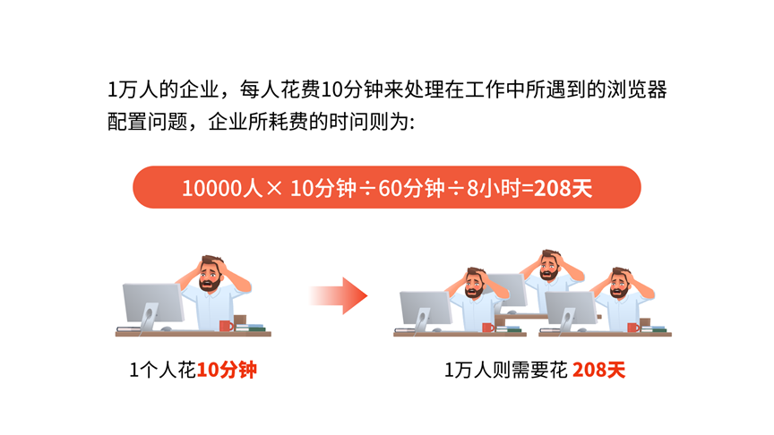 业务推进的前提是设备的统一性,但浏览器网络设置、插件管理、隐私设置......这些配置问题光是看着就不免让人头大。往往业务开启前,IT运维人员处理这样一个相关问题就要花费几十分钟的时间。因为无法对散落在终端的浏览器进行统一控制管理,所以在处理这些问题的同时,还需要考虑到对不同终端的不同情况进行单点维护,即便是十年业务老师傅在面对这些挑战的时候,也难免会留下两个字——难顶!