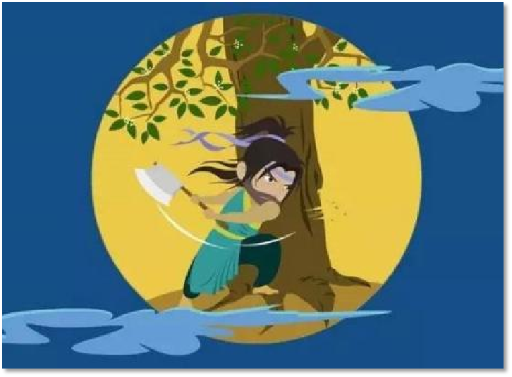 相传广寒宫前的桂树生长繁茂,有500多丈高,下边有一个人常在砍伐它,但是每次砍下去之后,被砍的地方又立即合拢了。几千年来,就这样随砍随合,这棵桂树永远也不能被砍光。据说这个砍树的人叫吴刚,是汉朝西河人,曾跟随仙人修道,到了天界,但是他犯了错误,仙人就把他贬谪到月宫,日日做这种徒劳无功的苦差事,以示惩处。李白诗中有“欲折月中桂,持为寒者薪”的记载。