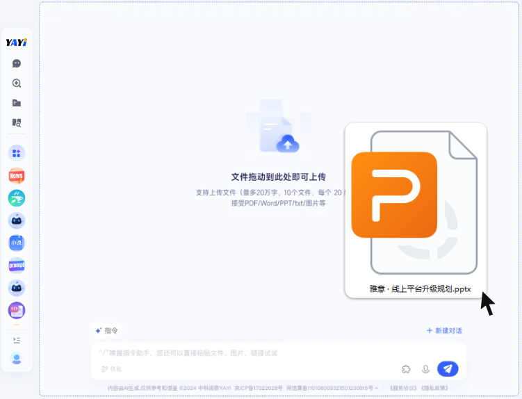 新增多种格式文件的上传识别和内容解读能力,PDF/Word/PowerPoint/txt/图片等主流文档格式均已支持,同时支持文档即时在线预览。