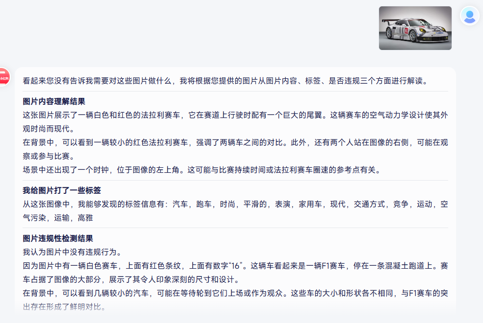 优化图片理解和识别能力,可基于图片完成三类默认识别任务,包括图片内基础信息识别、图片自动打标签、图片审核及违规检测。