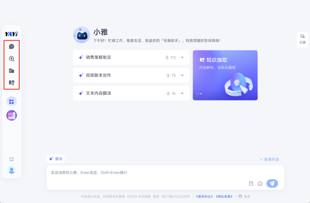 结合用户操作习惯及使用频率,全面改进主界面和交互方式,简约不简单。<小雅新建对话><知识库><知识抽取UIE><个人中心>等功能全部收纳至左侧边栏,方便用户快捷访问常用功能,操作更顺手,体验更丝滑。