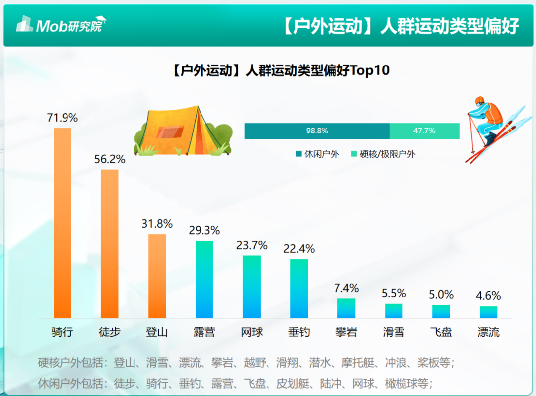骑行、徒步、登山作为户外运动三大顶流受到人们喜爱;从不同运动类型看,98.8%的人尝试过徒步、骑行、露营等休闲户外运动,近一半的人尝试过以登山、攀岩、滑雪为代表的硬核/极限户外运动。