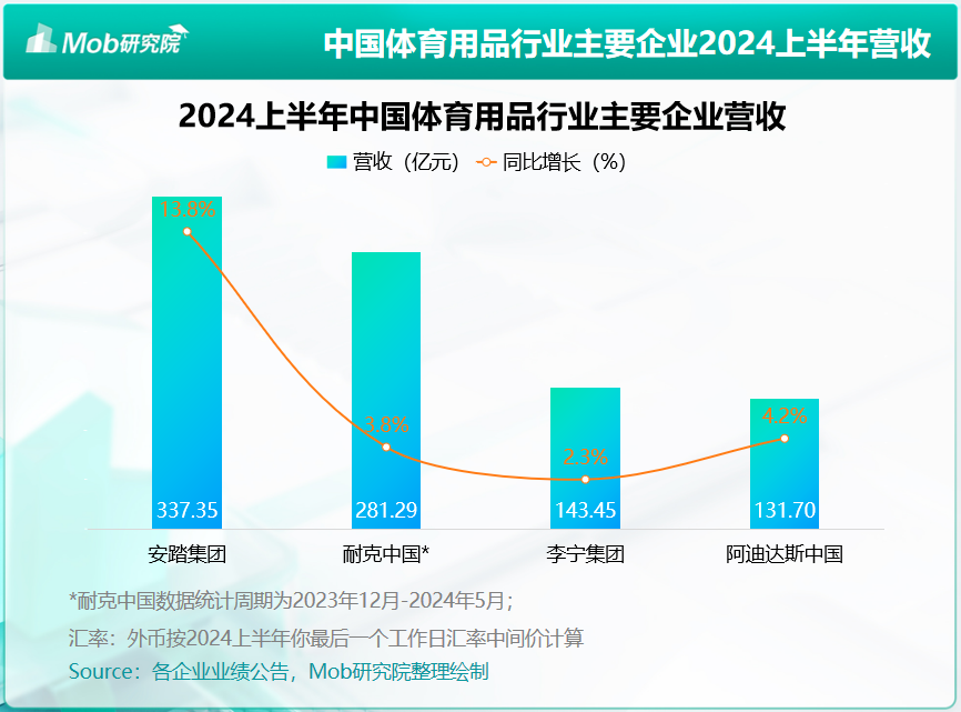 安踏集团、耐克中国、李宁集团、阿迪达斯中国分列2024年上半年中国体育用品行业企业营收前四位。安踏集团营收体量337.35亿元,对比耐克中国(281.29亿元)、李宁集团(143.5亿元)、阿迪中国(131.7亿元)优势明显。两大主品牌安踏及斐乐,上半年营收均创历史新高;探路者在2024年上半年营收达到7.08亿元,同比增长27.52%,归属于上市公司股东的净利润达到8550.21万元,同比大幅增长295.64%,盈利能力显著提升。