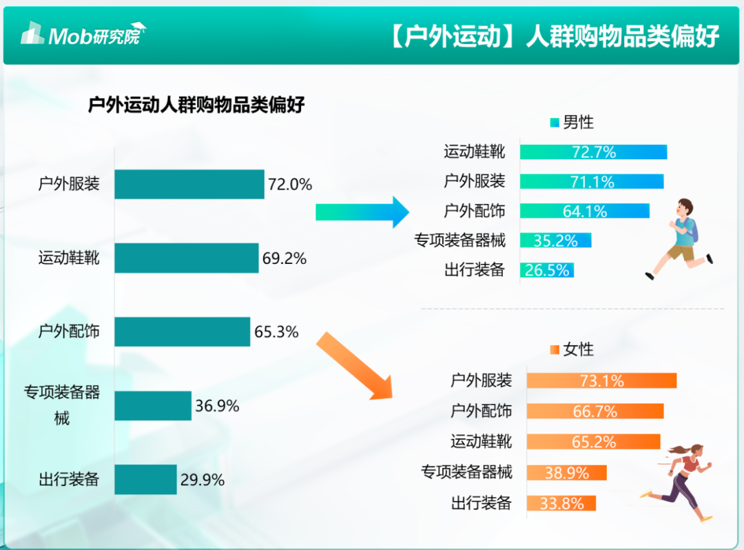 《户外运动人群洞察报告》数据显示,从品牌偏好看,户外运动人群外资和国资品牌认知度基本持平。对骆驼、探路者、始祖鸟、迪卡侬、凯乐石等运动品牌有着较高的认知度;LULULEMON受到女性喜欢。
