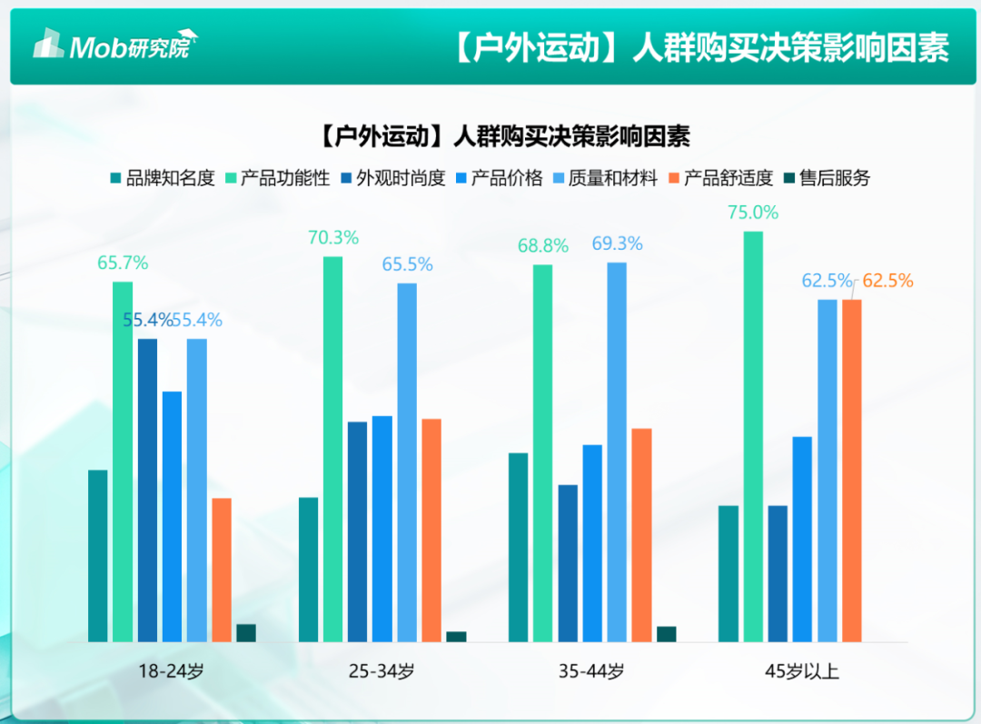 不同年龄阶段的人有自己的户外运动舒适区。18-24岁的年轻人,对网球表现出了较强的偏爱。徒步相对舒缓的节奏, 吸引了更多45岁以上的户外人。