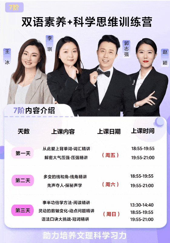 为了帮助每个孩子能够学有所得,本次特训营配备了清北毕业老师+一名专属指导老师。他们功底深厚,经验丰富,家长和孩子可以随时提问!