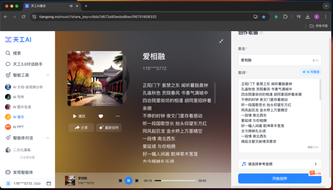 “正阳门下、紫禁之东,闻听暮鼓晨钟……”在东城区形象宣传片《爱相融》的悠扬旋律中,古都画卷徐徐展开。现场的观众想要考一考天工AI音乐大模型,灵机一动把“爱相融”歌词输入天工AI音乐大模型,不到一分钟,AI版本的《爱相融》缓缓唱起,流畅而富有感情的歌声让在场的观众纷纷对昆仑万维天工AI音乐大模型竖起了大拇指。