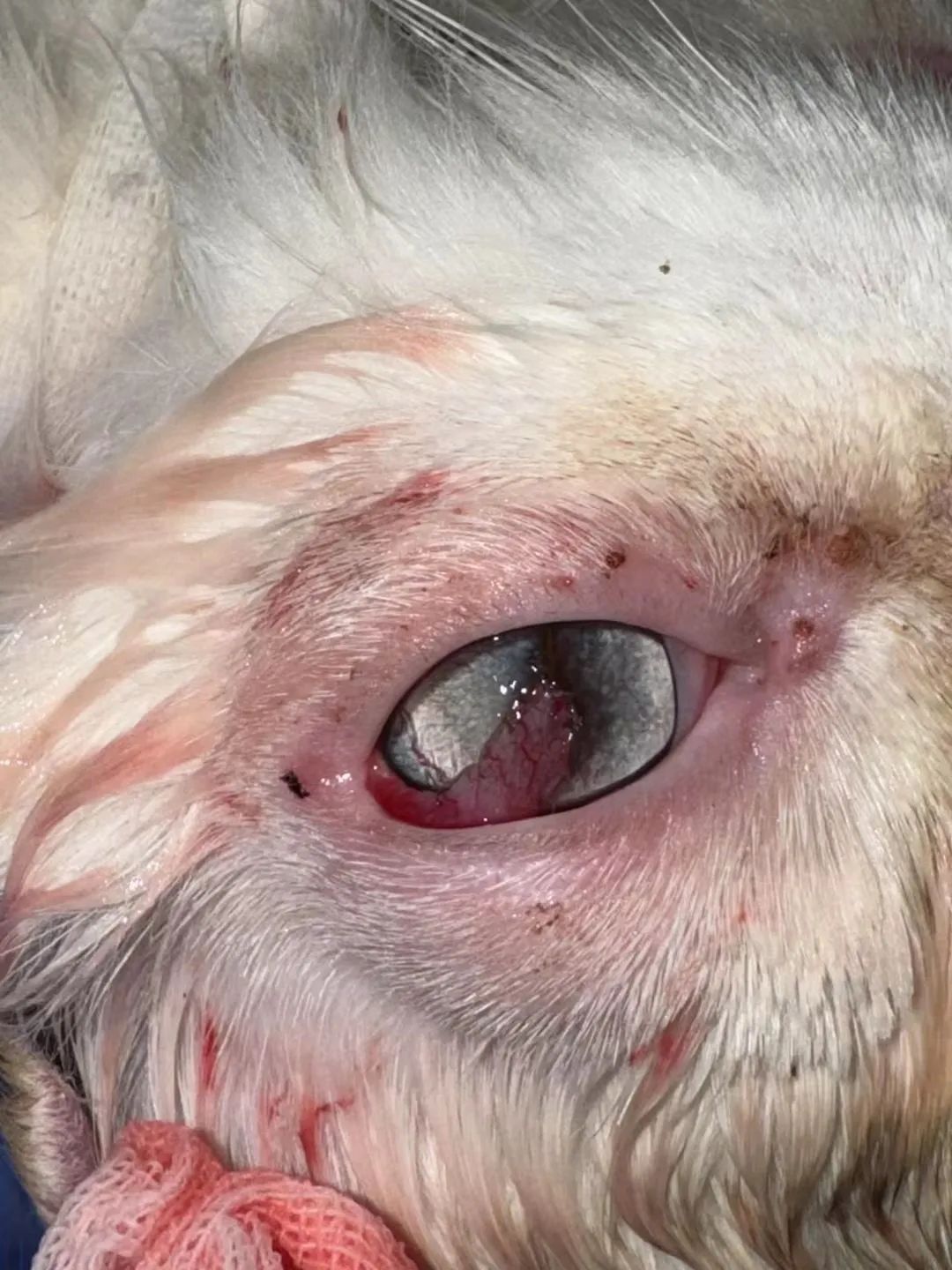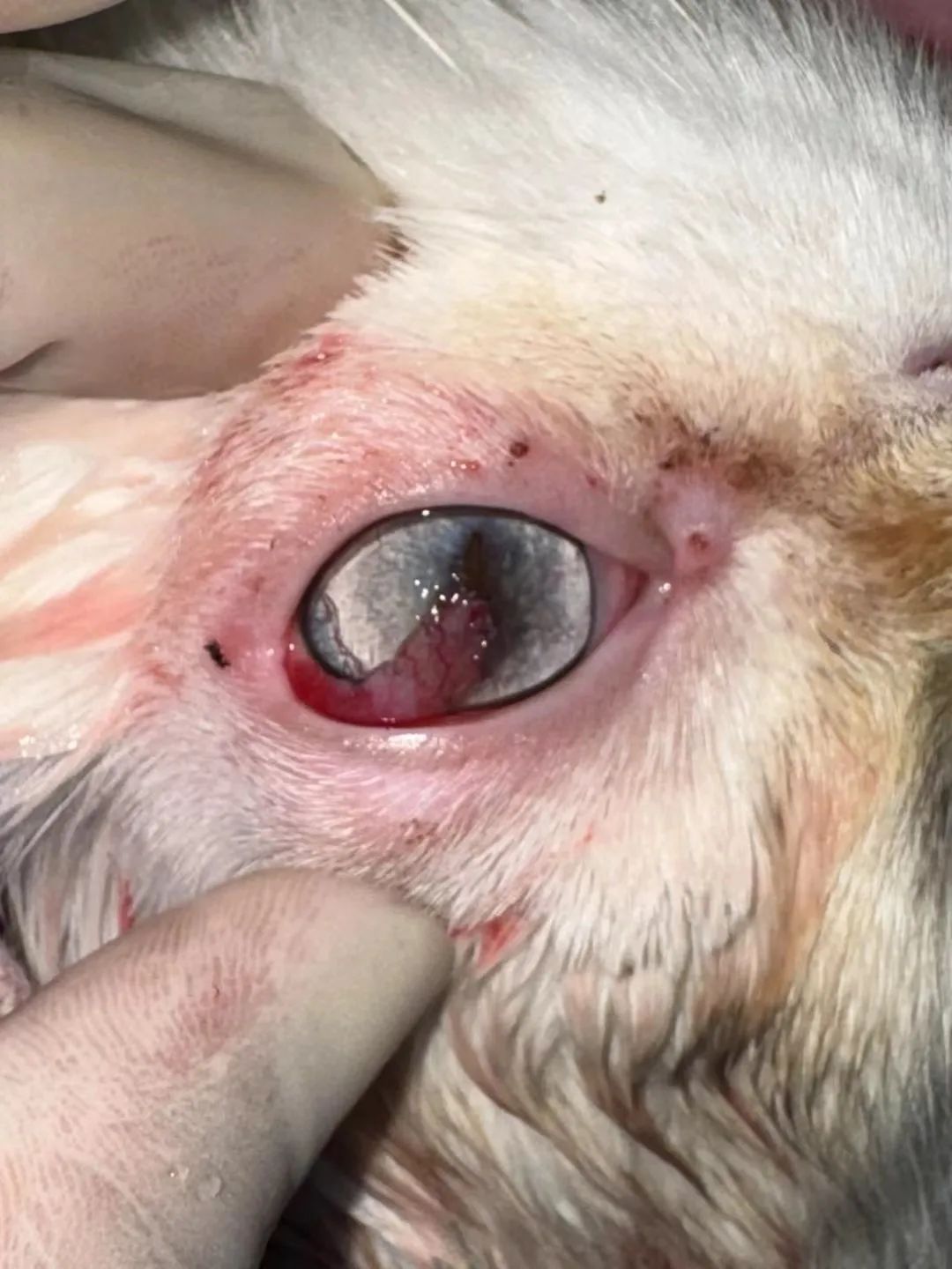 那威风凛凛、气宇非凡的帅气缅因,近来竟不幸被双侧眼睑内翻所困扰。你瞧,那原本应柔顺地垂在眼睑边缘的下眼睑毛发,此刻却不听话地内卷到眼内,仿佛顽皮的孩子在捣乱。这般状况直接导致了它的眼睛结膜变得红肿异常,好似熟透了的桃子,那原本明亮而澄澈的眼眸也难以睁开,仿佛被一层沉重的迷雾所笼罩。与此同时,泪水如决堤之水般源源不断地涌出,一滴一滴,仿佛在诉说着它的痛苦与不适。