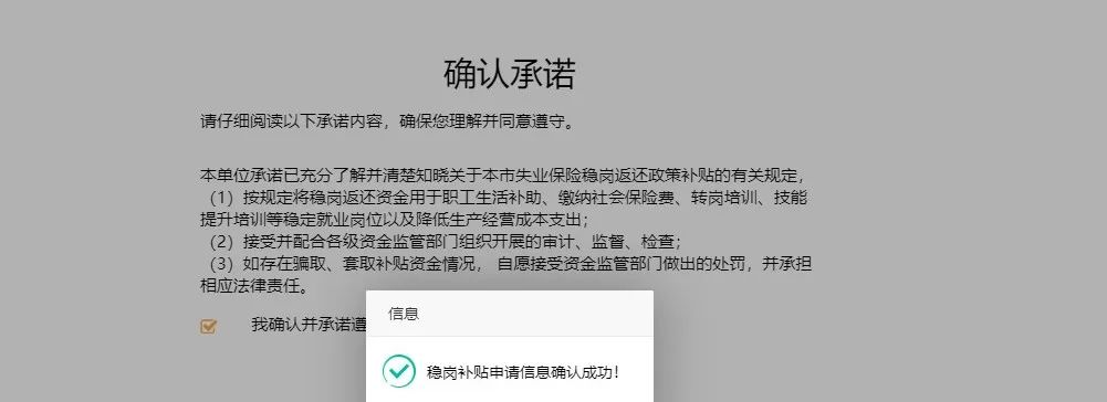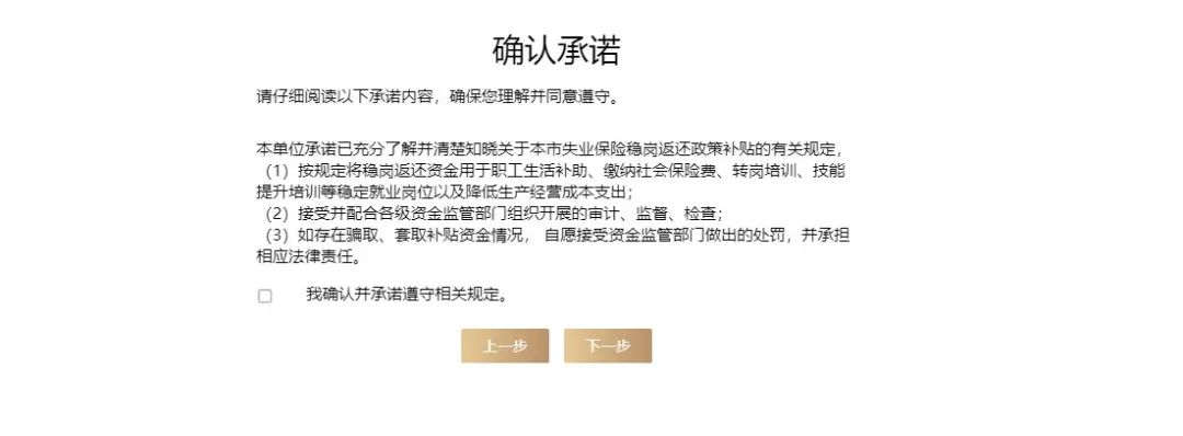 确认无误,点击下一步,阅读相关承诺内容。承诺内容勾选后,点击下一步,保存后进行提交。(意愿只需确认一次,未确认的在政策实施期内均能确认。)
