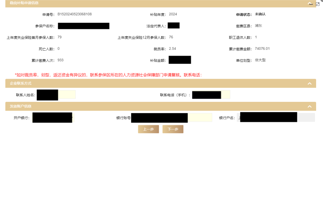 用人单位选择“愿意接收补贴并承担相应义务”后,进入信息确认界面,需重点对裁员率、划型、补贴金额、银行账户等信息进行确认。