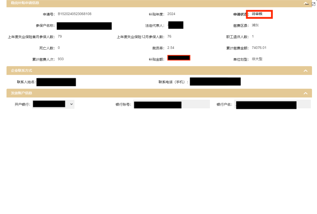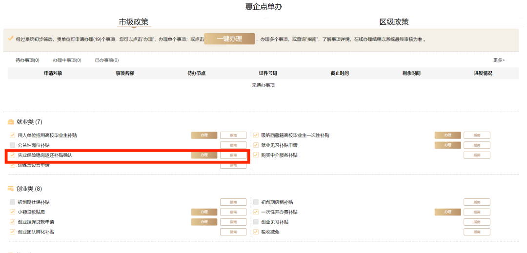 用人单位确认成功后,如需查询进度,可再次点击”惠企点单办”入口,选择“就业补贴:失业保险稳岗返还补贴确认”,查看“审核状态”(状态包括审核中,公示中,发放成功/发放不成功等)。