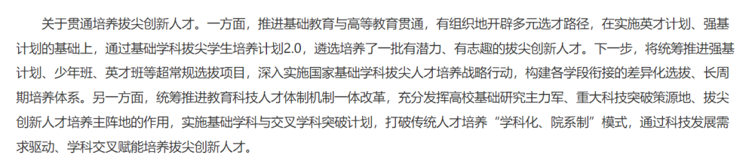 关于“拔尖创新人才培养”,教育bu门又有“新动作”了。近日,全国政协在京召开双周协商座谈会,对关于贯通培养拔尖创新人才的问题作出了重要回应:① 在实施英才计划、强基计划的基础上,通过基础学科拔尖学生培养计划2.0,遴选培养了一批有潜力、有志趣的拔尖创新人才。② 下一步,将统筹推进强基计划、少年班、英才班等超常规选拔项目,深入实施国家基础学科拔尖人才培养战略行动,构建各学段衔接的差异化选拔、长周期培养体系。”