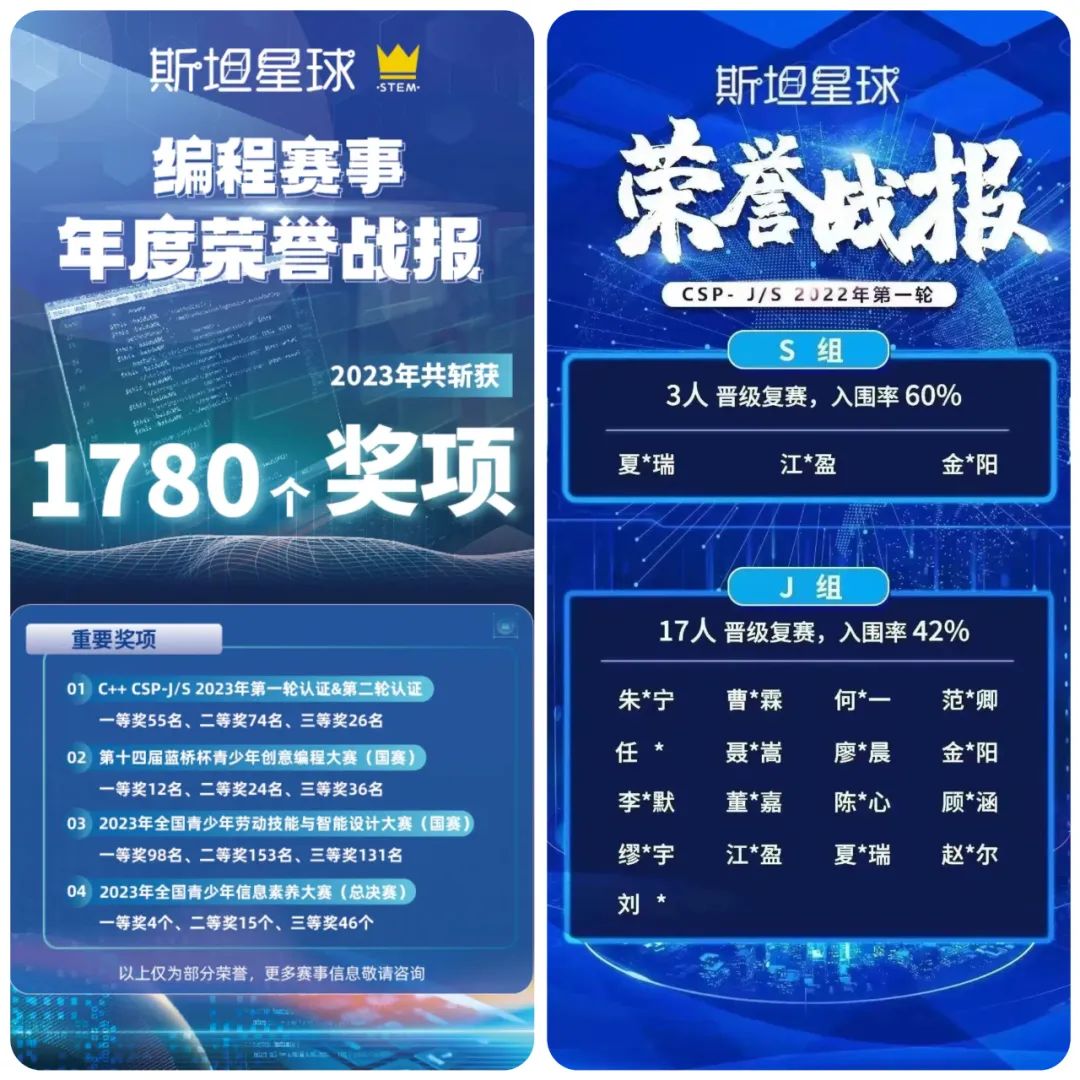 值得一提的是,斯坦星球OJ题库还有AI评判系统,能即时反馈代码的正确性及效能。系统还会依据学员的解题性能,定制化地提供练习题目,让他们的代码能力步步进阶。同时有赛制排名,增强竞技感,让孩子稳扎稳打冲刺竞赛!2023年,斯坦星球C++学员在CSP-J/S的第一轮和第二轮认证中共斩获55个一等奖、74个二等奖和26个三等奖,表现亮眼!