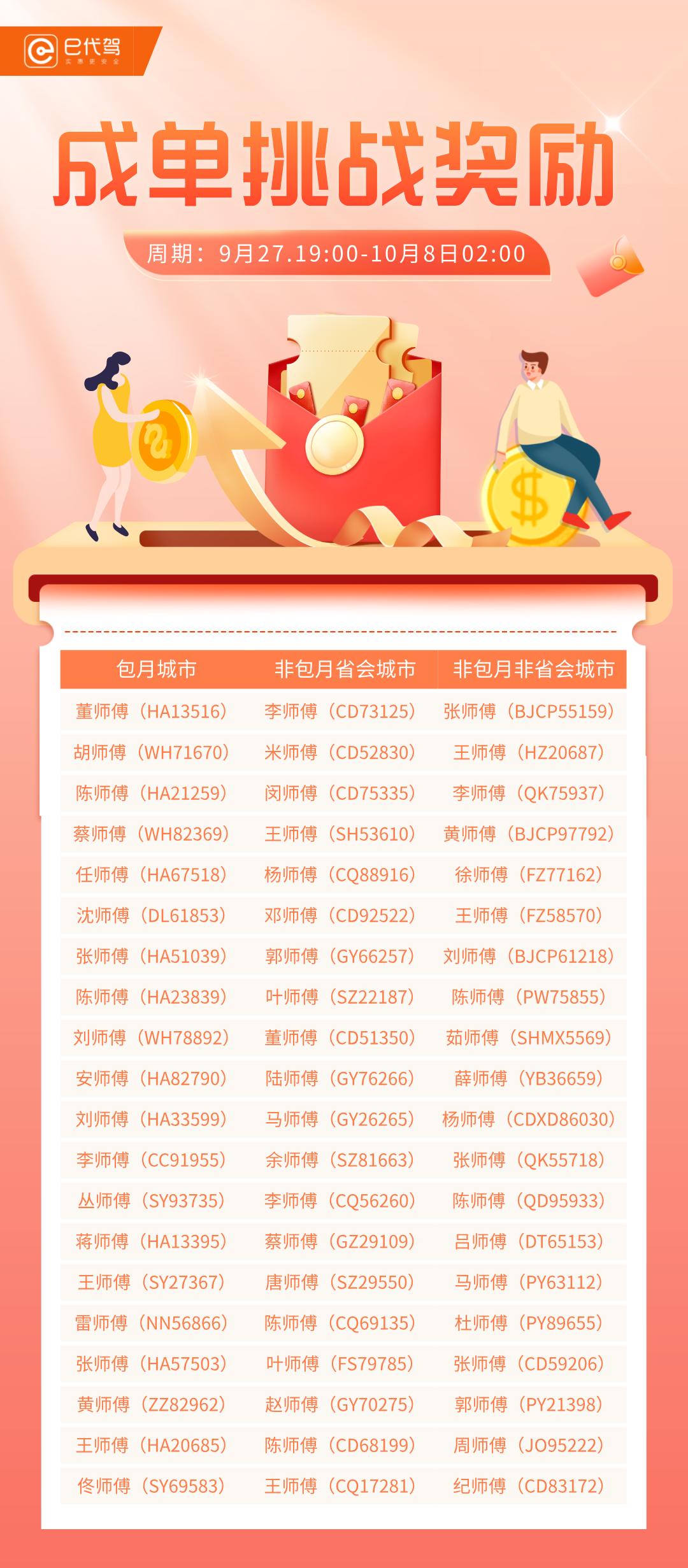 我们已经整理完所有数据,即将开始发放奖励。在每组中,成单数量排名前20的司机师傅将获得1000元红包大奖!以下是获得奖励的司机名单:
