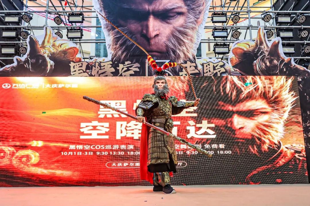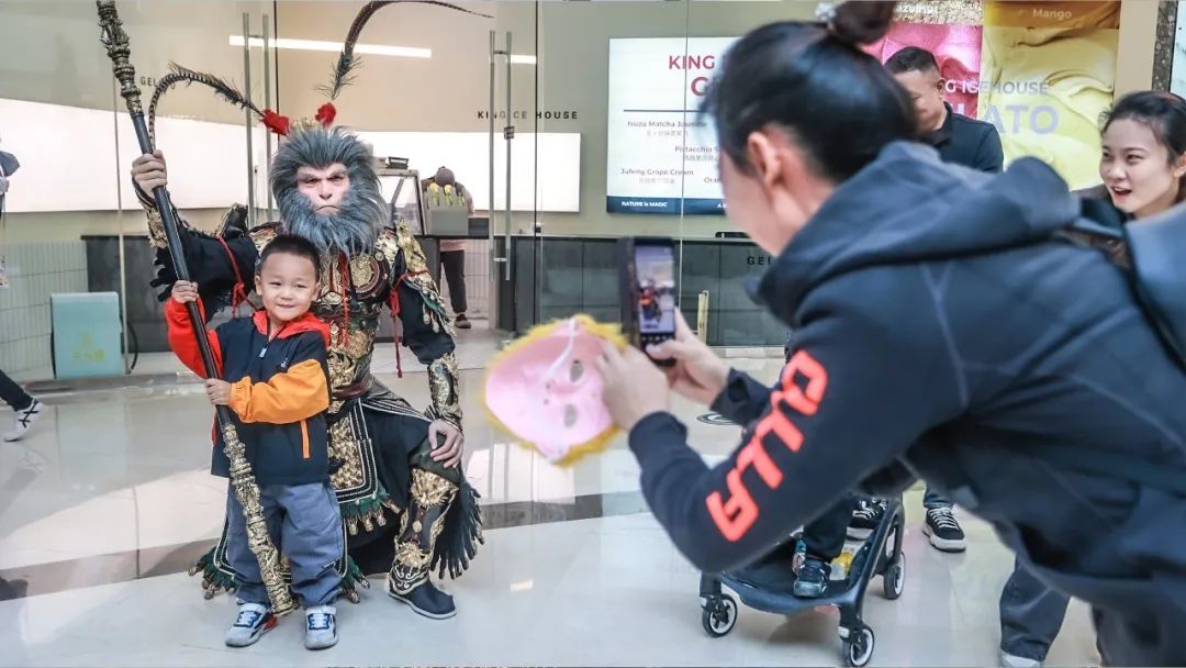 当然,要说时下最in国潮,万达君觉得还得是咱中国人的老idol,齐天大圣孙悟空。这不,“黑悟空”驾着七彩祥云空降大庆萨尔图万达广场,燃爆全场!