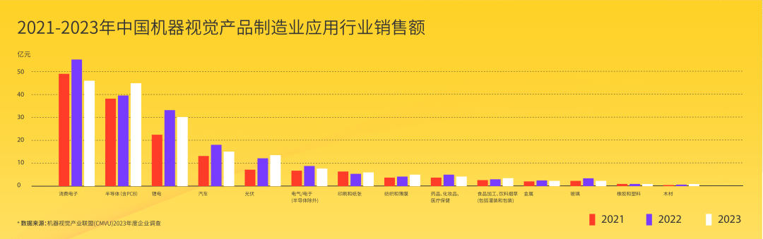 2023年,机器视觉下游应用行业中,电子信息、印刷、医药、玻璃等行业规模下降,影响对机器视觉产品的需求增长;食品、烟草行业规模增速放缓,对机器视觉产品的需求增长也有一定影响。另一方面,下游行业中,汽车、锂电、邮政业恢复增长,对机器视觉产品需求增速提升。中国机器视觉市场销售额整体增长10.7%,增速较2022年回落6.4个百分点。