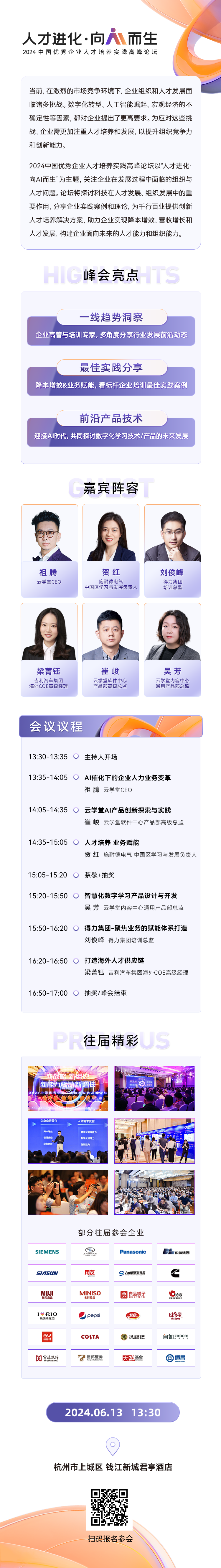 国内企业数字化学习与人才培养的重磅活动——2024中国优秀企业人才培养实践高峰论坛,将于6月13日在杭州拉开帷幕。以“人才进化·向AI而生”为主题,本次论坛旨在探讨如何在AI时代下,通过发展“人才”这一竞争优势助力业务,让组织更好地面向未来,实现业务的持续增长。作为备受瞩目的年度盛会,2024中国优秀企业人才培养实践高峰论坛已陆续落地上海、深圳、北京、广州、武汉等10余个国内重点城市,汇聚国内领先的企业和专家,分享行业最佳实践和前沿技术,为企业提供更多启示和参考,推动数字化时代企业人才培养和组织发展的进步。
