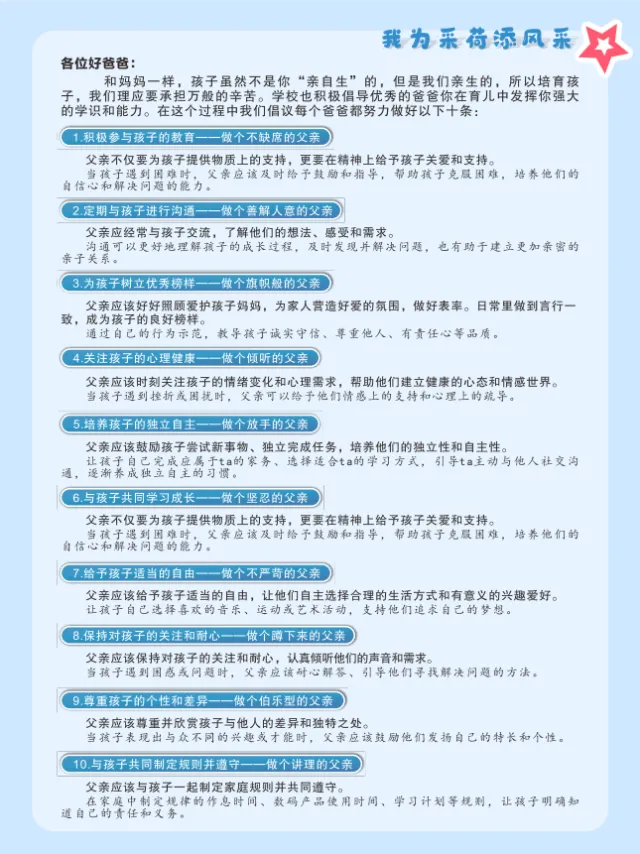 学校还特意安排了一份,只能由爸爸来签字的协议——“好爸爸十条”。