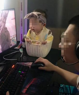 比如把孩子装进桶里摆在一边,心系电竞的老父亲。