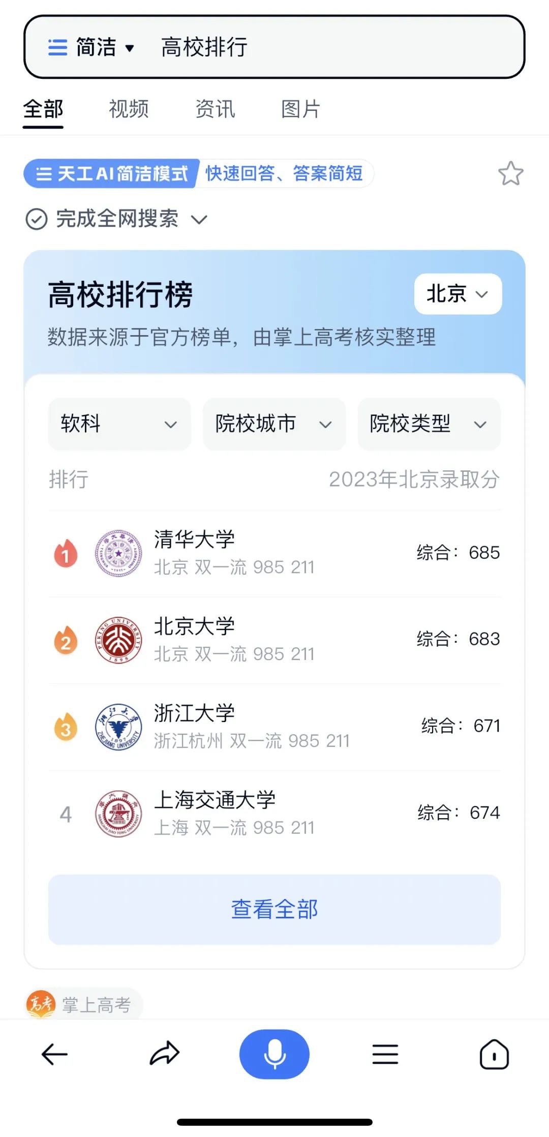 比如:可以直接向天工AI提问:“历年高考分数线”,“xx专业高校排行榜”,几秒钟内天工AI就能调取历年录取分数线和全国高校排行榜,供考生进行参考和分析,作为自己高考志愿填报重要的参考依据。