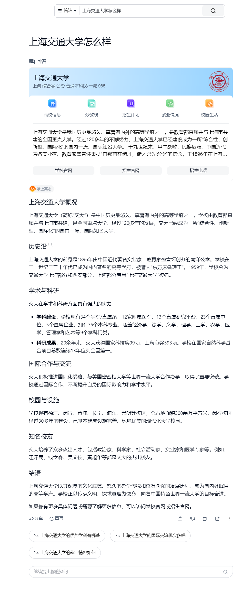 如果你已经选定了自己心仪的院校,但了解还不够仔细、全面,可以直接用天工AI搜索查询,比如你可以直接问天工:上海交通大学怎么样?几秒内,天工就能生成详细的介绍页面。如果需要更详细的院校信息,还可以直接跳转到学校官网。