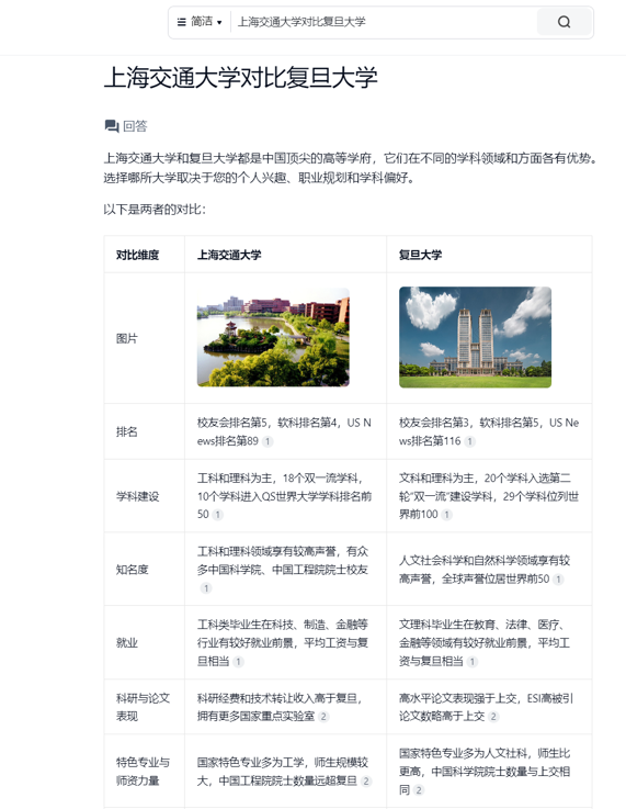 同级别院校之间难以做抉择?可以让天工AI横向对比分析两所大学。比如:上海交通大学对比复旦大学。天工自动生成对标表格,且图文并茂,清晰明了。对比维度非常科学和全面,考生和家长最关注的问题都有体现。
