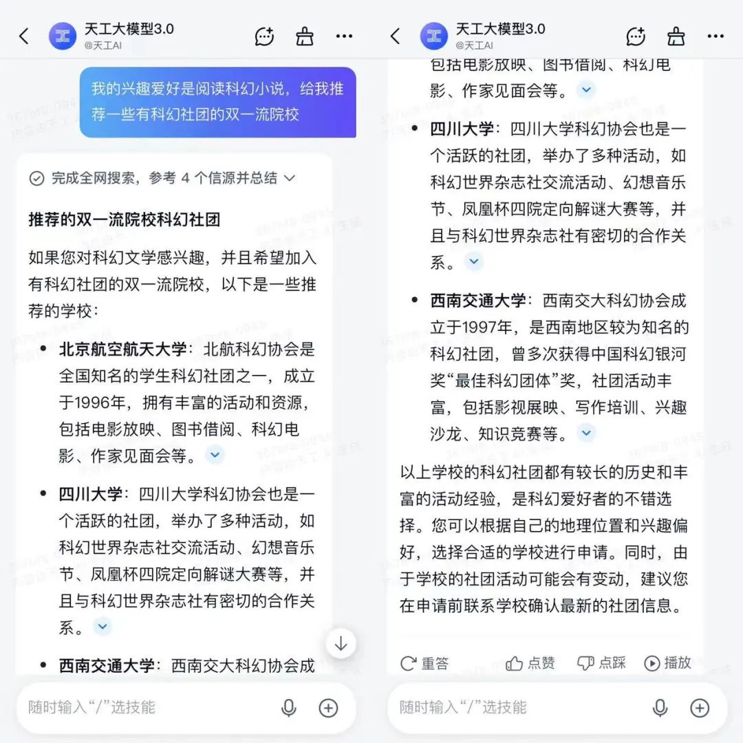 此外,天工AI能够为考生们提供精准、个性化的规划与建议。提问天工AI:我的兴趣爱好是阅读科幻小说,给我推荐一些有科幻社团的双一流院校。天工即刻就能给出合适的建议。