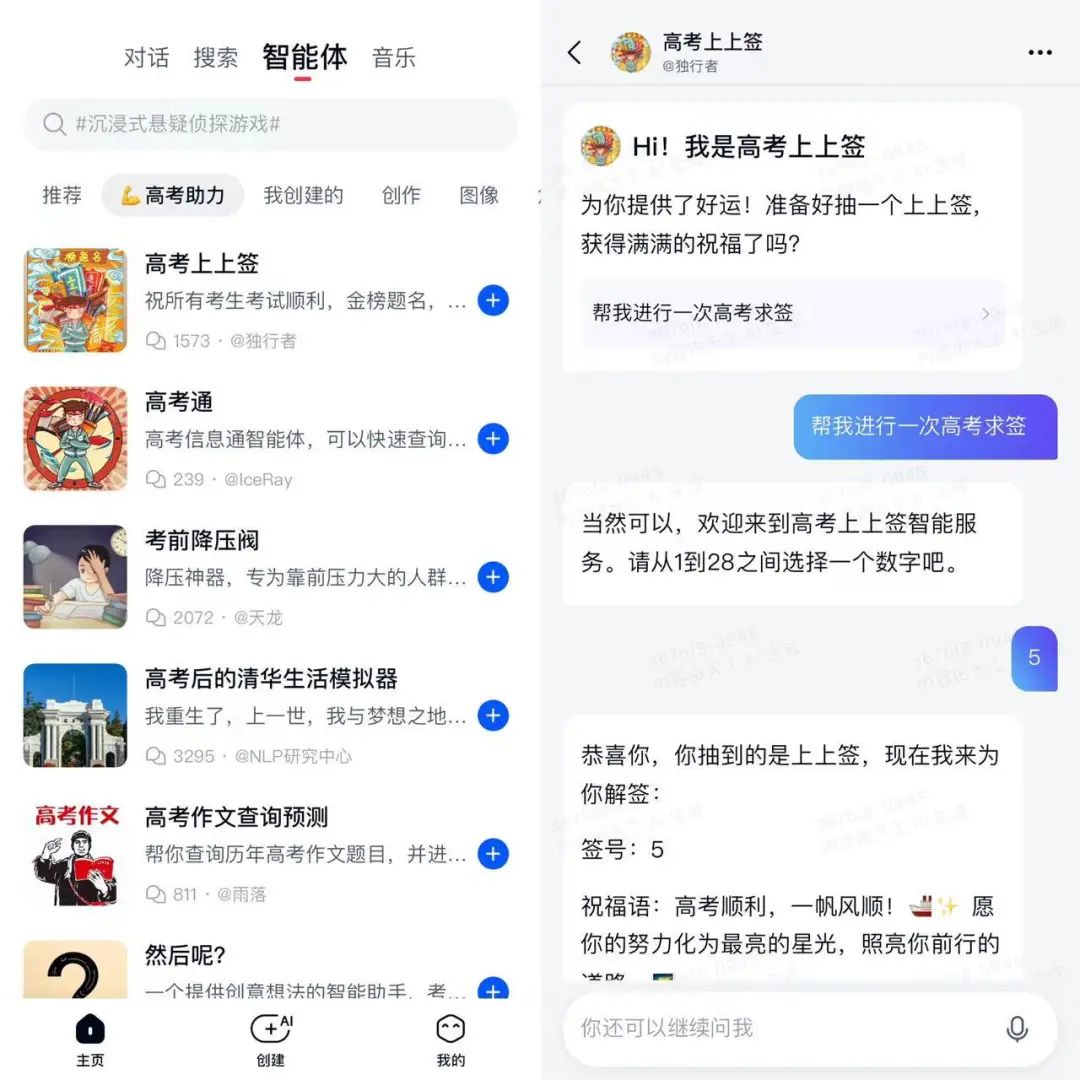 在智能体广场页面,天工AI专门设置了【高考助力】的主题单元,收纳官方以及网友UGC的各类高考相关的智能体近两百个,能够满足考生关于高考方方面面的需求。