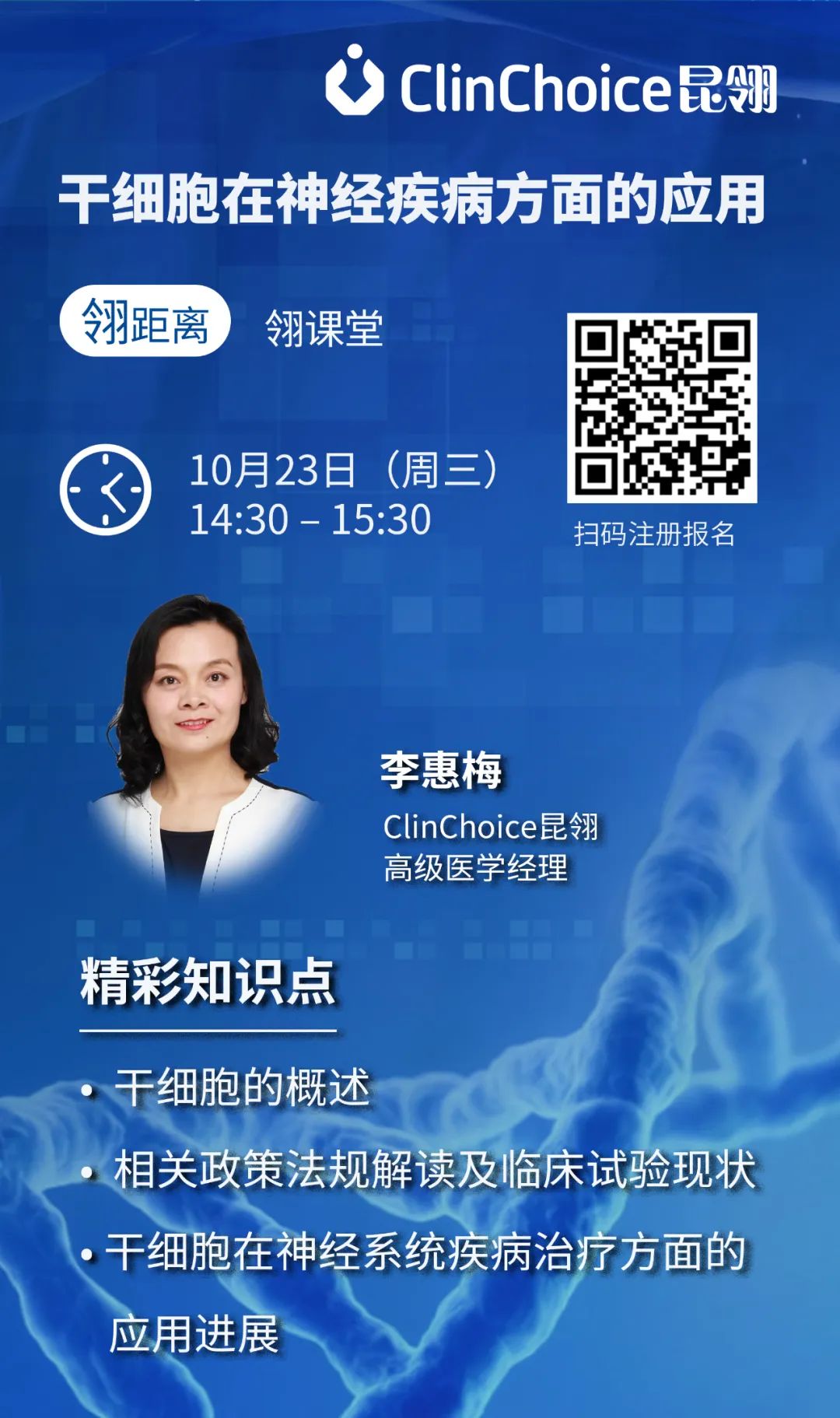 2024年10月23日(周三),ClinChoice昆翎将邀请此领域专家,从干细胞的基本概念出发,探讨相关政策法规及临床试验现状,并重点介绍干细胞在神经系统疾病治疗方面的应用。诚挚邀请您参与此次网络会议,如需参会,请扫描下方二维码进行注册。希望此次会议可以为行业内外人士提供一个全面而深入的视角,共同探索干细胞疗法的无限可能。