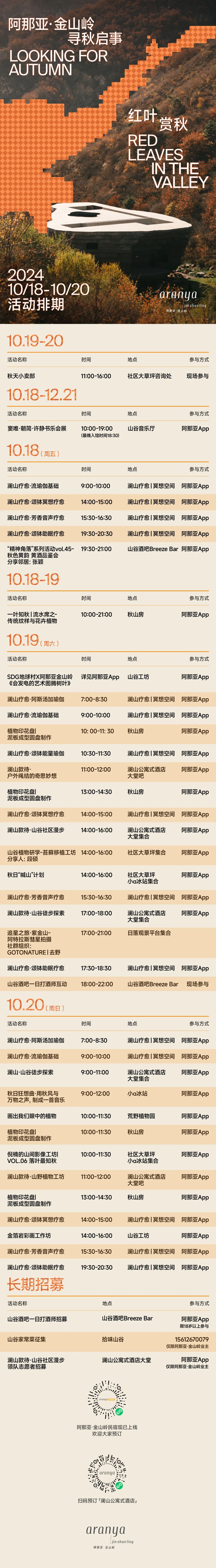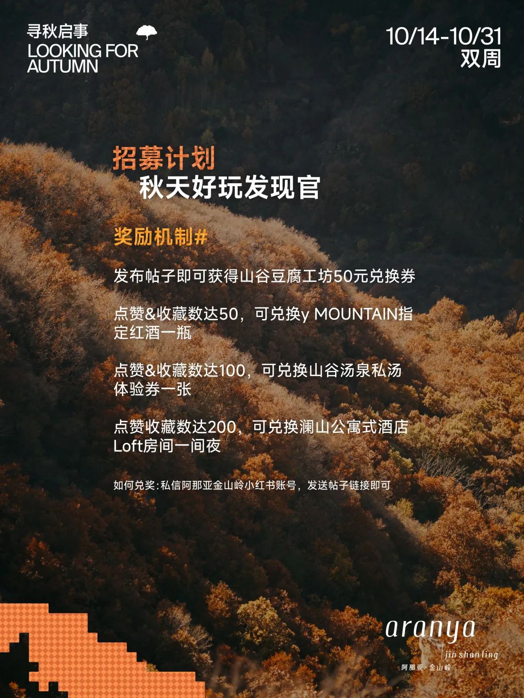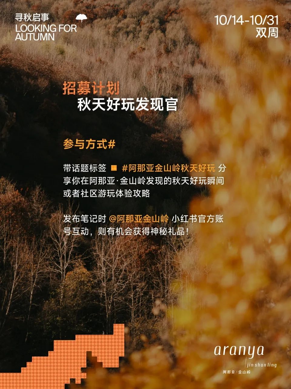 欢迎来阿那亚·金山岭,加入一场寻“秋”启事,秋色、秋味、秋声,都在柔软的谷地中酝酿地刚刚好,我们准备了风格各异的玩法,等待着有心人的到来。