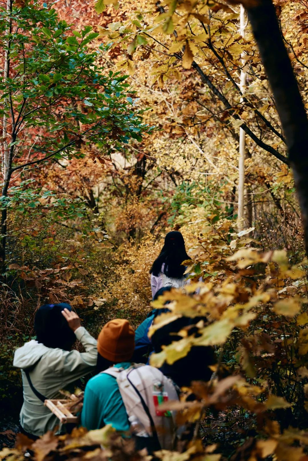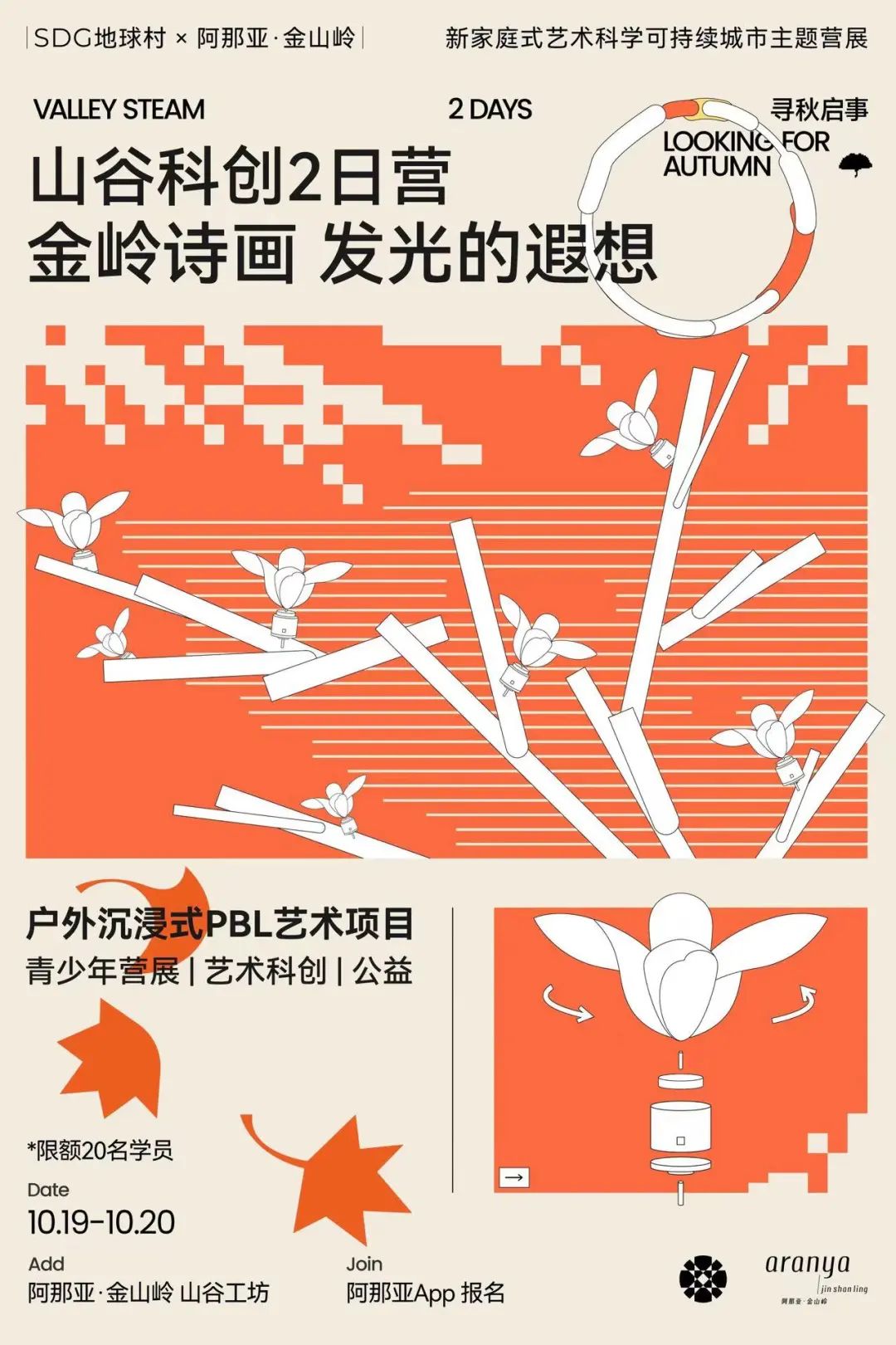 坐上秋天的巴士,开始一场沉浸式秋日浪漫之旅,金山岭的秋天,宜散步,宜喊山,宜慢慢走,徐徐品,宜调动五感感受天地万物。“喊山”是当代都市人的打卡必选项,城市呆久了,偶尔登高徒步,向山呐喊,找一个情绪出口,给疲惫的身体和心灵做个大扫除,感受源自自然的潇洒能量。想看最正宗的本地人玩法,邻居总是最了解金山岭的本地向导,如果你也爱摄影,不妨跟随邻居倪楠穿梭在林间小道,用镜头记录下那些稍纵即逝的壁纸级美景,每一次快门,都是对落叶秋野的深情告白。体验派贵在真实,走进山林,亲手描绘书本网络上见到的植物,亲眼见证他们的野蛮生长和自由自在,是活在线下的感受与表达。荒野植物园经常组织绘画课,带大家走进植物绘画的世界,以绘画的形式描绘一种山中植物,留下你对它最真实的感受。“自古逢秋悲寂寥,我言秋日胜春朝。”对生活有感知的人,总是会在秋天充满灵感。如果热爱自然主义,一定试试粗犷绚丽的岩彩画,不必拘泥于造型和创作的条条框框,大胆地贴箔、烧箔、洒金,用传统技法,定格一刹那的秋日之美。秋天自带一种轻盈的白噪音,听觉敏感的朋友们说山中徒步的同时,也在感受自然amsr,有兴致的话,尝试采集金山岭的叶落、风响、鸟鸣的声音,再汇编成曲,即兴融合,奏响属于自己的「秋日狂想曲」。赛博赏秋你听过吗?SDG地球村带领孩子们利用物理、生物科技等方式拆掉思维里的墙,探索将树叶转化为会发电的艺术图腾背后的奥秘所在。这不仅是一次对艺术品新生命的探索,更是对机械生命体未来无限可能的想象!