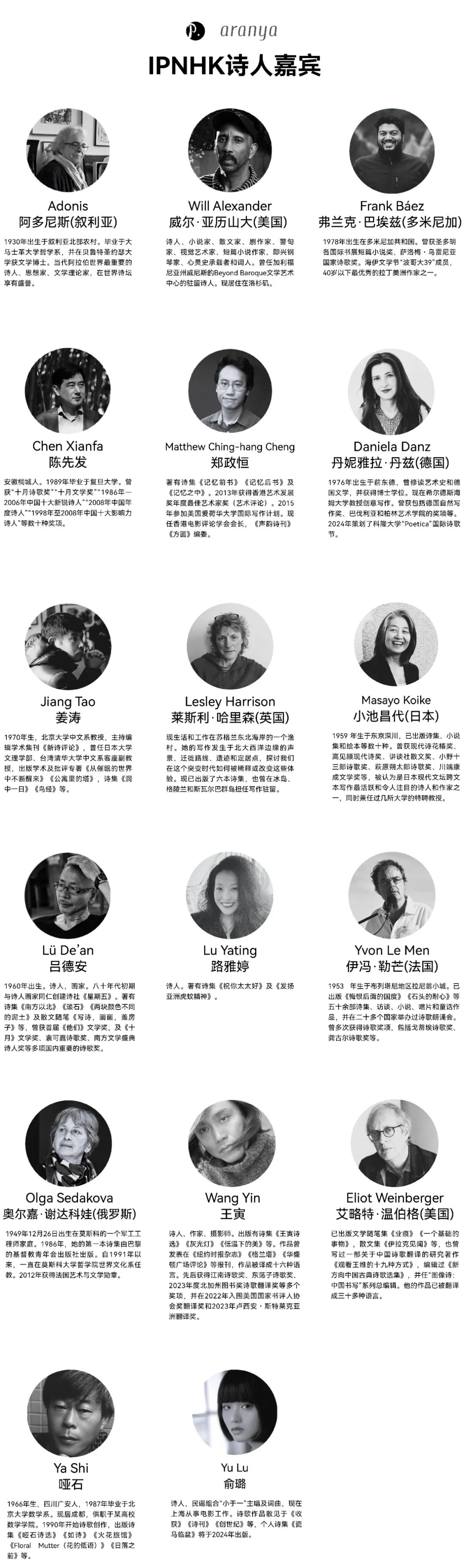 国内著名诗人西川、王寅、陈先发、郑政恒、姜涛、吕德安、哑石等,将与其他来自欧洲、亚洲、美洲等国家和地区的重量级诗人,如阿多尼斯、小池昌代、伊冯·勒芒、艾略特·温伯格、威尔·亚历山大等,共同加入这场诗歌的盛会。