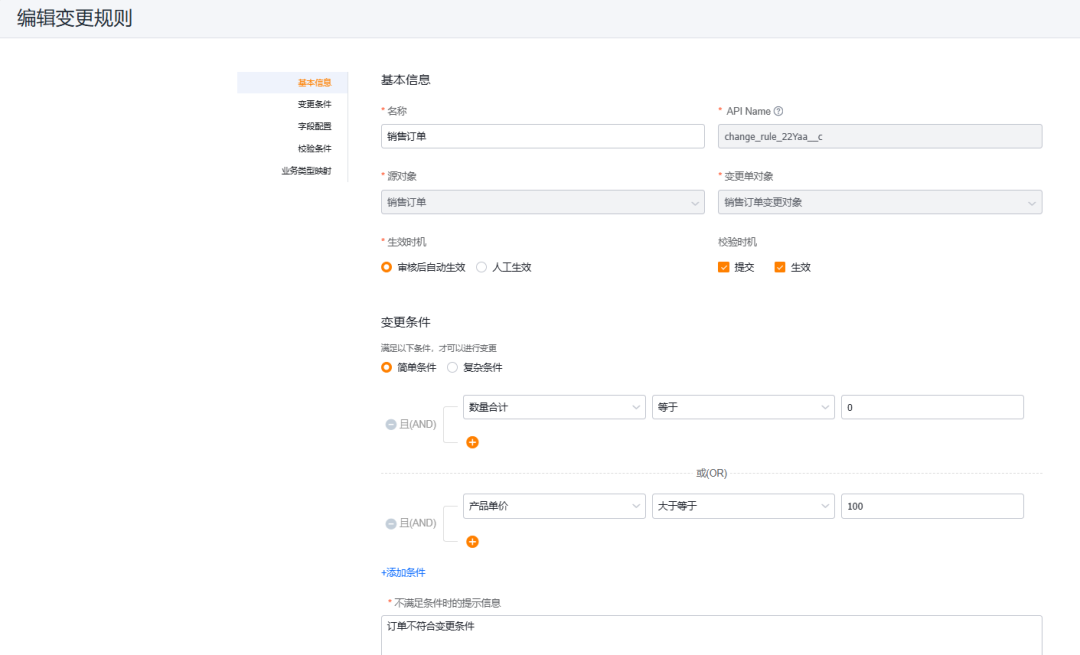 此外,管理后台还支持其他个性化配置,如 ”生效/校验时机“ “字段配置” “业务类型映射” 等,企业可以根据自身业务需求,轻松定制相应条件,使变更单功能更加贴合企业的业务流程,实现精准化服务。