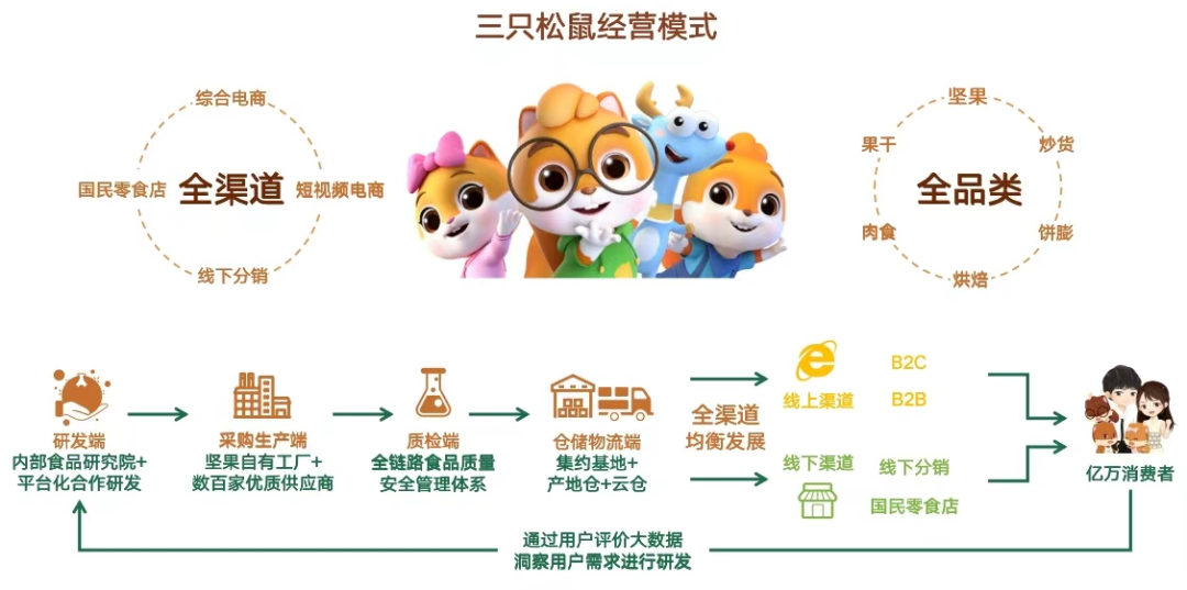 要回答上面的问题,我们必须得从中国零食产业格局演变说起。据Frost&Sullivan预计,2026年我国休闲零食行业零售额将达到11427亿元,2021-2026年的年复合增长率约为6.8%,保持稳健增长。零食行业爆发式增长,每个人都有体会。最直观的表现就是以赵一鸣、来优品等为代表的新兴量贩式零食集合店,近两年正迅速占领社区街道、小区周边的许多门面。新“玩家”在瓜分市场的同时,也改变了原有的市场和渠道逻辑:消费者不再执着于消费升级,而是更追求理性消费。“头部零食品牌在过去两年都面临较大挑战,如果没有及时调整好战略方向,很可能会掉队。”一位业内人士表示。7月26日,安徽召开数字化转型推动制造业高质量发展工作会议,安徽省领导在会上举例说,三只松鼠从诞生之日就有了数字化基因,成为“靠腮呼吸的鱼”。然而,就算是三只松鼠这样的数字“原住民”, 在行业“变天”的过程中,也“蛰伏”了近四年。面对新的市场环境,如何推进变革、变革是否彻底,决定了一家企业的生死。转型阵痛让章燎原痛定思痛:“为什么营收达到百亿规模后,没能继续增长?主要原因在于当时我们没有搞清楚自己是谁。”三只松鼠成立之初的快速增长,离不开“互联网+消费”兴起的时代红利。但在面临供需关系发生巨变时,三只松鼠也需要做到因时而变、因势而变。过去人们常说品牌之间的竞争,是企业和企业之间的竞争,是供应链与供应链之间的竞争,但实际上现在已经是生态与生态之间的竞争。恰在这时,“新质生产力”概念被提出,并迅速成为关注的焦点,为三只松鼠的转型打开了“脑洞”。三只松鼠党委书记潘道伟认为:“新质生产力的实践,不能简单理解为引入高科技,而是要做到全链路、全要素的优化提升,激发每个环节的潜能。”因此,三只松鼠主动顺应产业融合发展和培育壮大新质生产力的大势,谋划一场从原料、制造到交付的全链路深刻变革,在竞争激烈的休闲食品赛道中杀出一条创新之路。那么,顺势而为的三只松鼠,是怎样布局的?