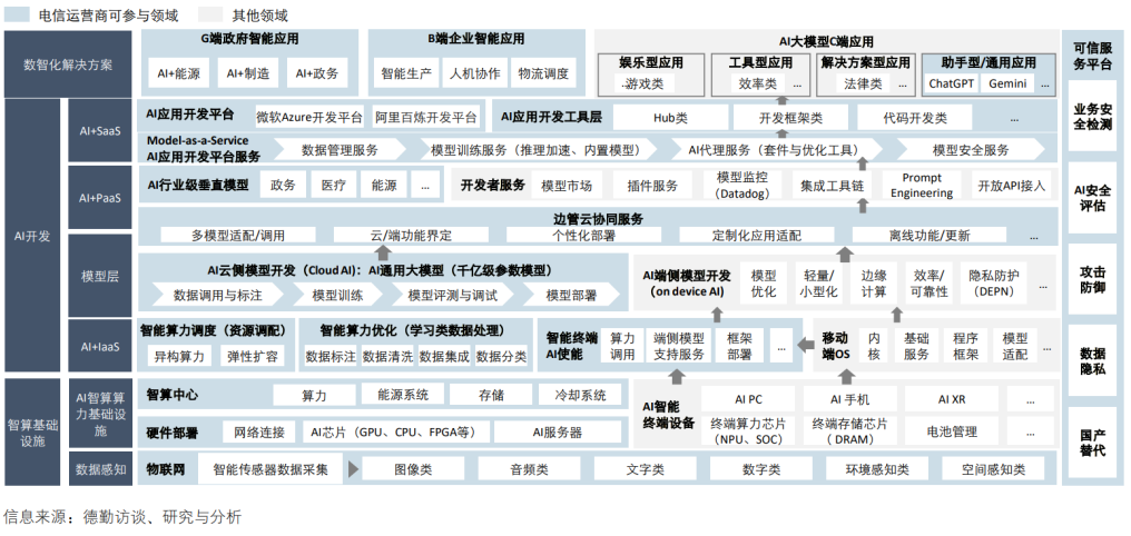 从全球范围内电信运营商的布局来看,电信运营商在AI大模型全生态链上可以提供多种关键产品和服务,这些服务利用其现有的云计算、算力基础设施和网络数据传输能力来支持AI大模型的发展。中国电信运营商同时参与国家信息化建设和数字经济的发展,是公有云市场的重要参与者,同时积极部署垂直行业和个人消费场景中的智能化应用产品和服务,推动经济社会的数字化转型,是生态链中极为重要的参与者。