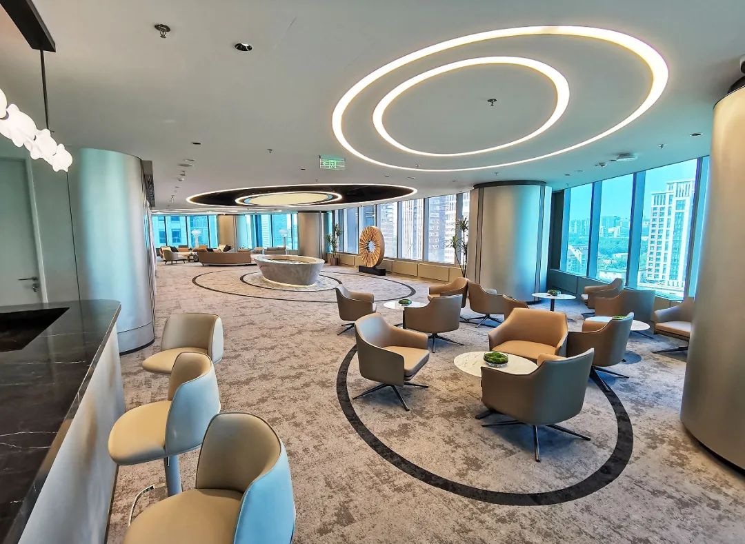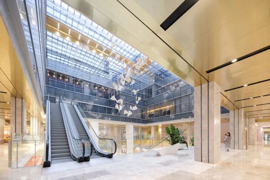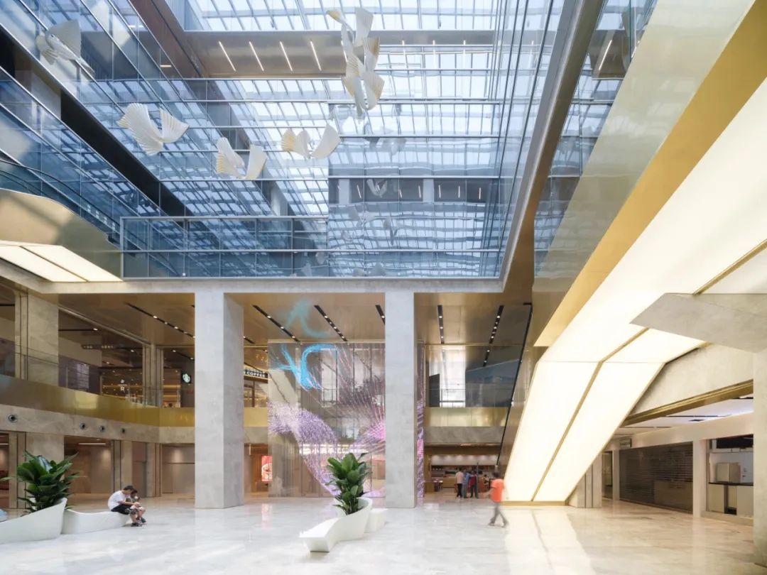 项目改造的核心理念是 “以人为本”,在功能上为现代化办公提供了更多可能。设计师们重新塑造了内部空间,将原本阴暗、闭塞的竖井结构转变为一个明亮、开放的多功能公共区域。中庭区域的重新规划成为项目改造的亮点,它不仅增强了两座塔楼之间的联系,而且还扩展了楼宇的采光面,引入自然光,增添了绿植和艺术装饰,为汇京双子座大厦带来了生机。