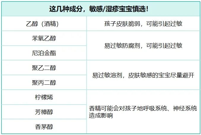 选择宝宝使用的护肤品时,一定要注意成分表中是否含有刺激性成分,比如香精、色素、酒精、争议性防腐剂等。