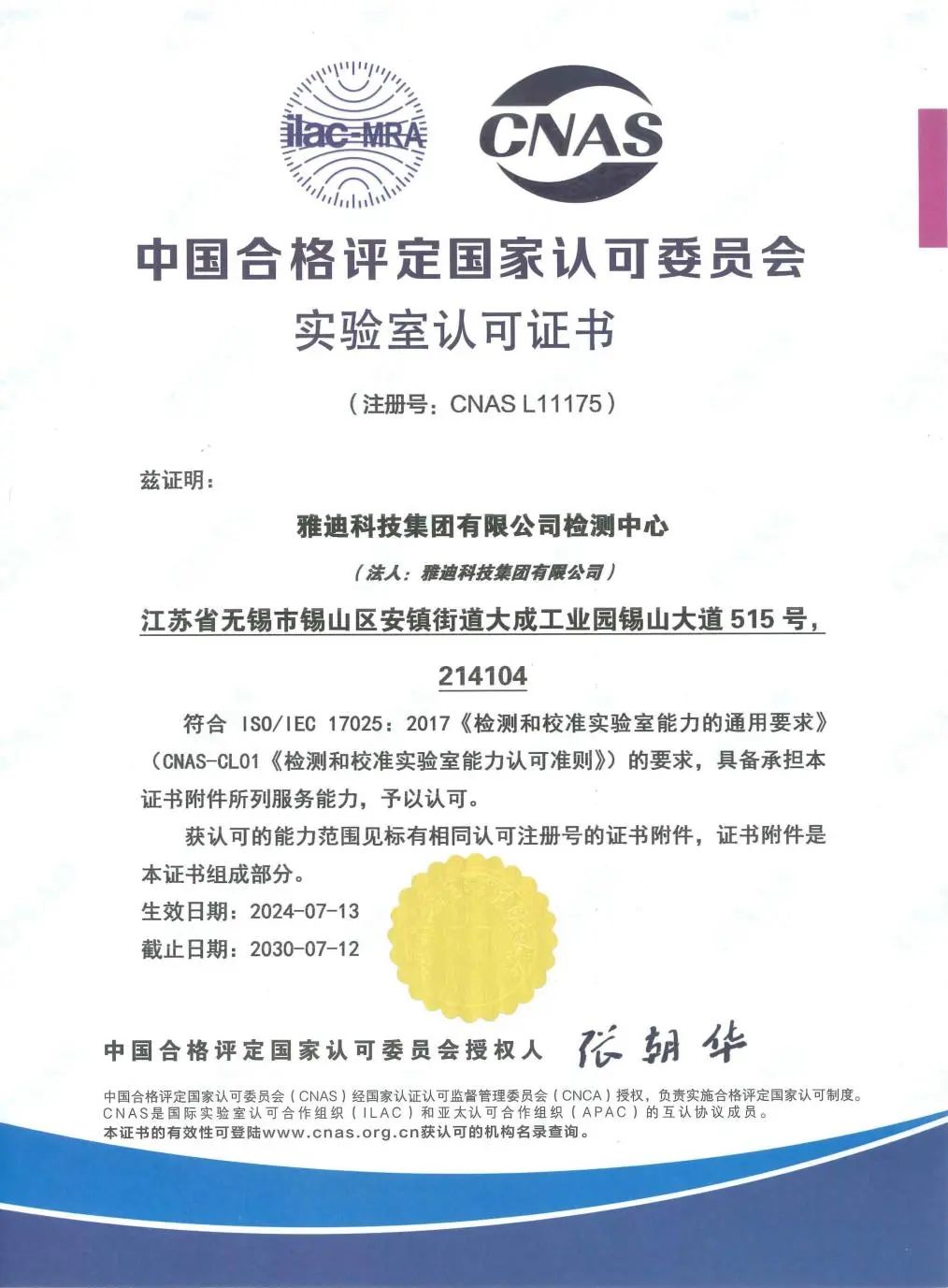 早在2014年,雅迪便率行业之先落地建成获得CNAS(中国合格评定国家认可委员会)认可的国家级企业实验室,可为电动两轮车行业提供从零部件到整车的全流程全方位检测,并输出被全球80多个国家和90多个国际机构所承认的检测报告,这一检测报告也可作为企业出口和通关的资质材料,这不仅让“雅迪品质”成功受到国际社会及专业机构的认可,更是对雅迪多年严格坚持质量管理、严保行业品质的高度点赞。