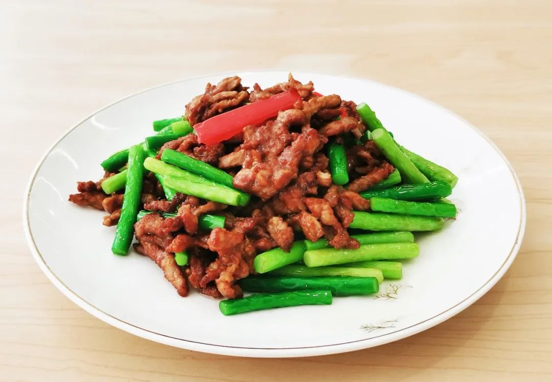 蒜苗炒牛柳(蒜苗15g、牛肉60g、彩椒少许)