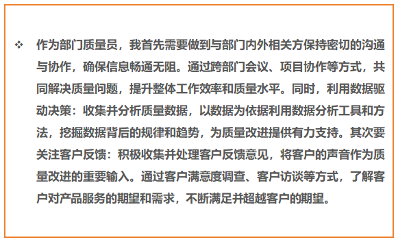 本次活动不仅加强了员工的质量管理知识,还激发了员工对如何提升工作质量的深入思考,分享了许多宝贵的案例和经验。这为公司营造了一个“人人关心质量”的企业文化氛围,为公司未来的质量管理和产品服务质量的提升奠定了坚实的基础。