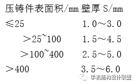 b. 铸件壁厚不能太薄,太薄会造成铝液填充不良,成型困难,使铝合金熔接不好,铸件表面易产生冷隔等缺陷,并给压铸工艺带来困难;压铸件随壁厚的增加,其内部气孔、缩孔等缺陷增加,故在保证铸件有足够强度和刚度的前提下,应尽量减小铸件壁厚并保持截面的厚薄均匀一致,为了避免缩松等缺陷,对铸件的厚壁处应减厚(减料),增加筋;对于大面积的平板类厚壁铸件,设置筋以减少铸件壁厚;根据压铸件的表面积,铝合金压铸件的合理壁厚如下: