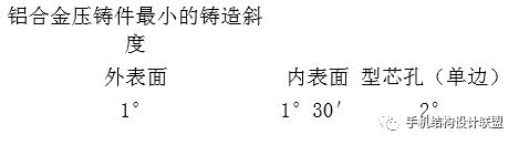 斜度作用是减少铸件与模具型腔的摩擦,容易取出铸件;保证铸件表面不拉伤;延长压铸模使用寿命,铝合金压铸件一般最小铸造斜度如下: