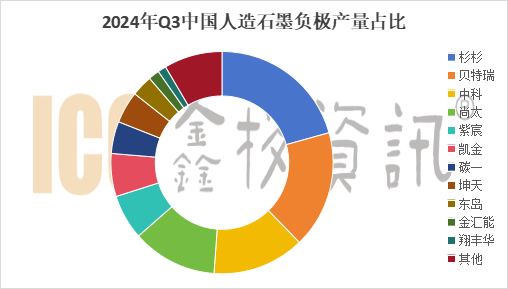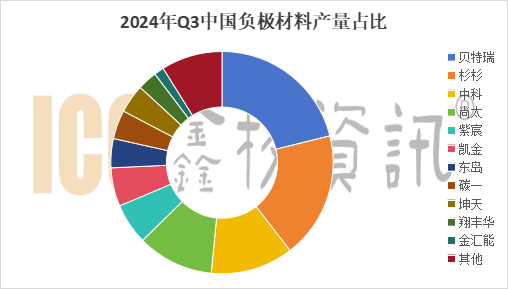 据ICC鑫椤资讯数据显示,2024年Q3国内人造石墨负极材料总产量约49万吨,上海杉杉占比21%,凭借着领先的技术优势和市场地位,市占率仍居首位。