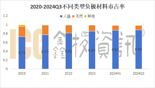 就材料类型来看,国内人造石墨负极仍占据主流地位,人造负极占比不断提升,2024年Q3占比达约88%,创历史新高。